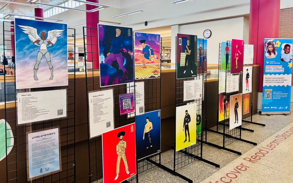In 2025, Locked Achievements travelled to four different venues! Our final stop of the year was at the Little Village Branch of the Chicago Public Library. There, Stomping Grounds Literary Arts Initiative hosted two open mics and and know your rights training. At the first open mic, The Beautiful Cat presented letters of mitigating evidence to the youth who were in the exhibition. These letters are in the youths’ official records in order to help prove to judges that they are capable of achieving significant things that have a positive impact on the public. We are extremely proud to have helped make these exhibitions a reality. Learn more about the LIttle Village exhibition here.