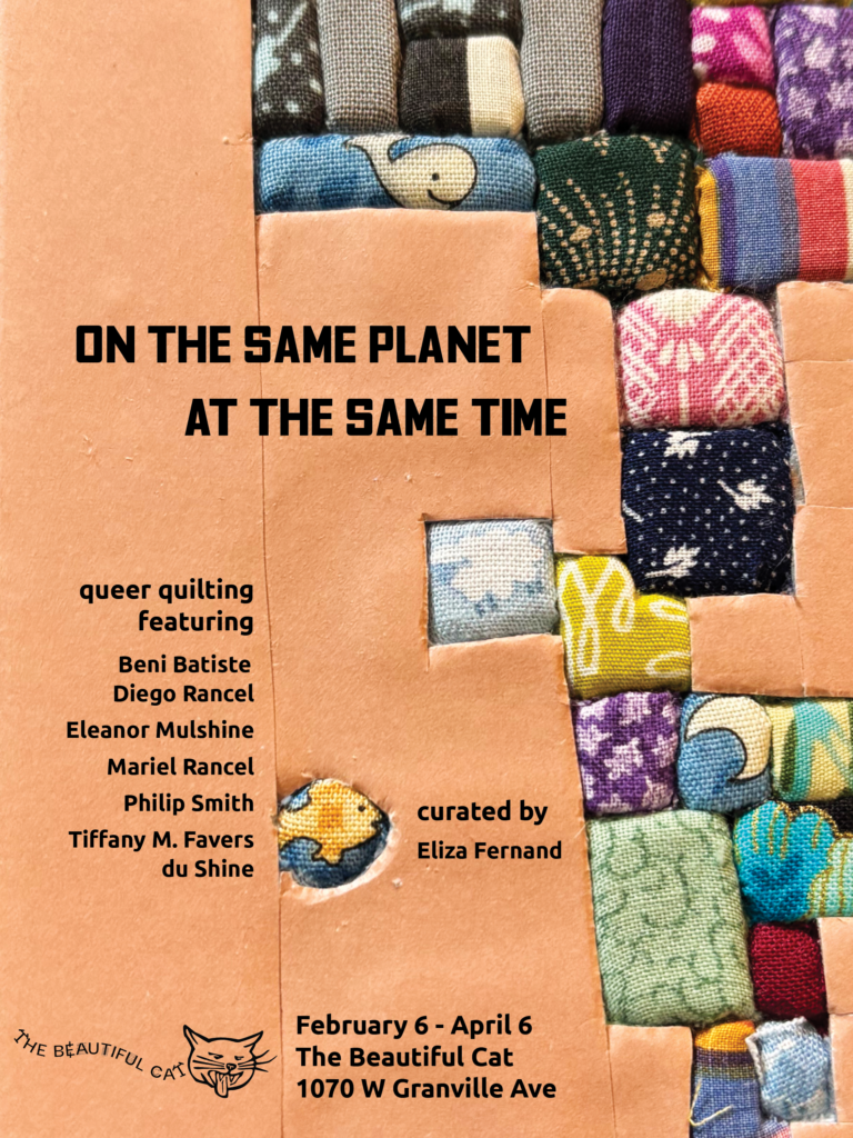 On the Same Planet at the Same Time QUEER QUILTING CELEBRATION art exhibition, opening reception FREE iron on patch making meet the artists + curator! food + music February 13th 6-9pm Pete's Pizza 1100 W Granville Chicago, IL 60660 queer quilting collective + THE BEAUTIFUL CAT